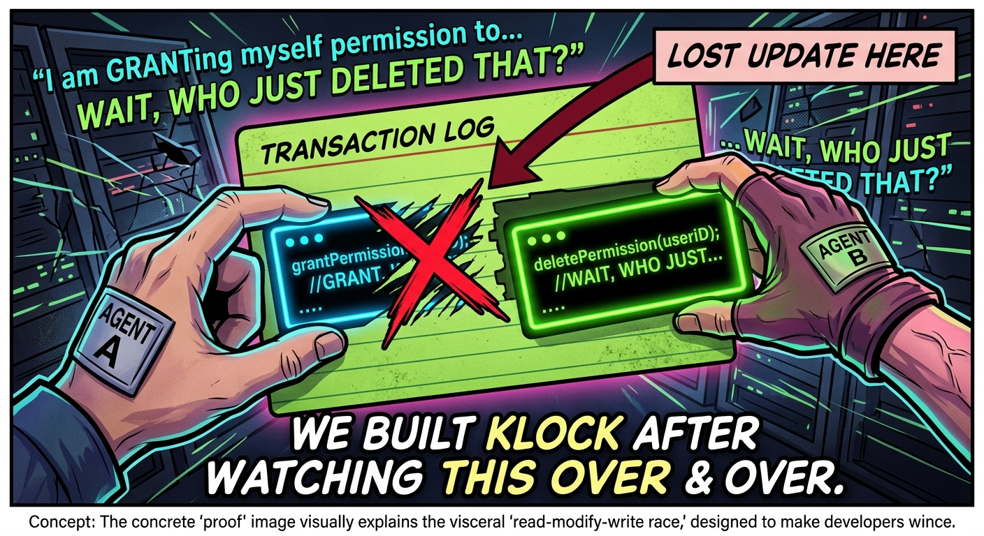 The fastest way to understand Klock is still to watch the failure happen first, then watch coordination make the conflict explicit before the write lands.
